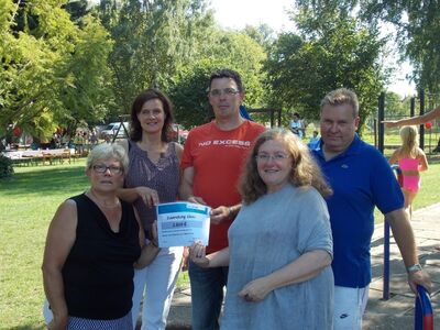 Zum Schwimmbadfest des Ebelebener Sport- und Schwimmbadvereins e.V. überreichte die Landrätin des Kyffhäuserkreises, Antje Hochwind in Vertretung der Thüringer Finanzministerin Heike Taubert, einen Lottomittelbescheid über 2.600 Euro. Dafür soll die Söffelpumpe des Schwimmbades repariert werden. Die Landtagsabgeordnete Dorothea Marx hatte sich bei der Ministerin für den Antrag stark gemacht. Ebenfalls anwesend bei der Übergaben waren der Ebelebener Bürgermeister Uwe Vogt, sowie Ursel Ludwig und Marco Bartsch vom Schwimmbadverein.