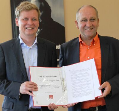 Landrat Hartmut Holzhey nahm am Dienstag eine Liste von Bürgerthemen vom SPD-Bundestagskandidaten Christoph Majewski entgegen. Der Saalfelder Majewski hatte in den letzten Monaten an tausenden Türen im Landkreis Saalfeld-Rudolstadt geklingelt und Gespräche mit den Bürgern geführt.