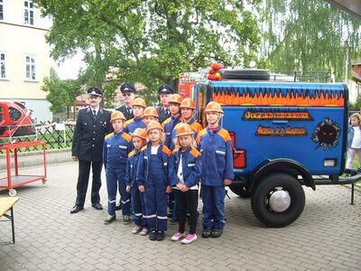 Voller Stolz präsentierten sich die Kinder und Jugendlichen der Freiwilligen Feuerwehr Berka v. d. Hainich vor dem bunt gemalten Hänger ihrer Jugendfeuerwehr.